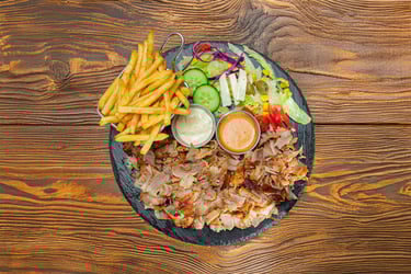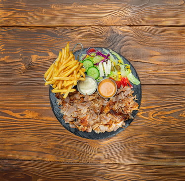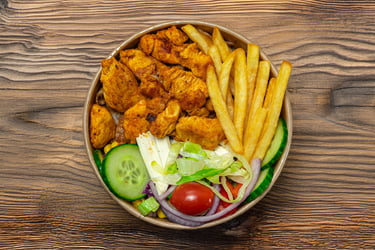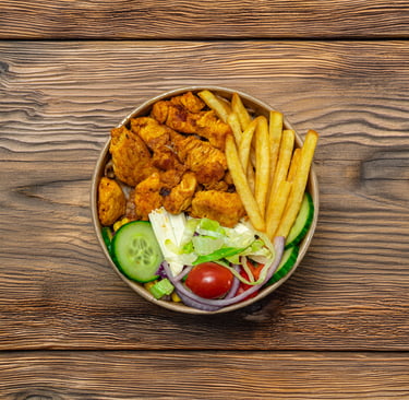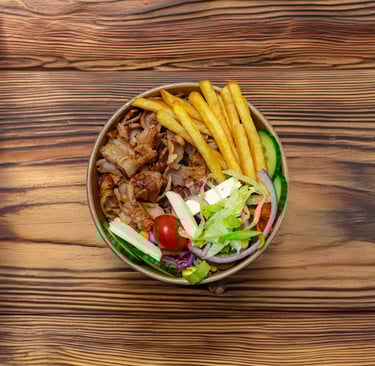 Poulet, boeuf ou mixte, salade, concombre, tomate cerise, chou rouge, aubergine grillé & courgette grillée, feta, sauce blanche maison