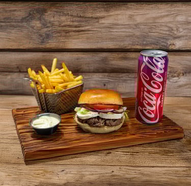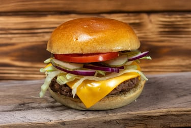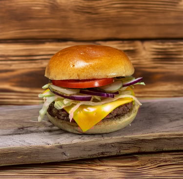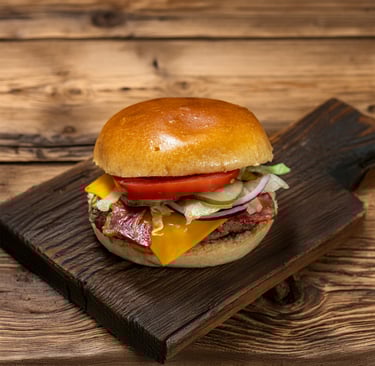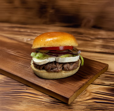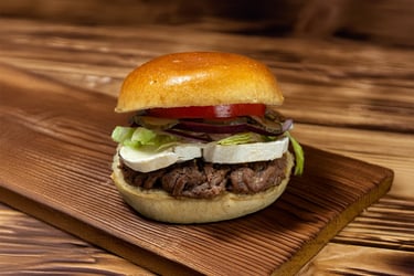 Pain brioché, steak 150 g, cheddar, salade, tomate, cornichons, oignons rouges - sauce burger