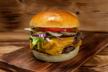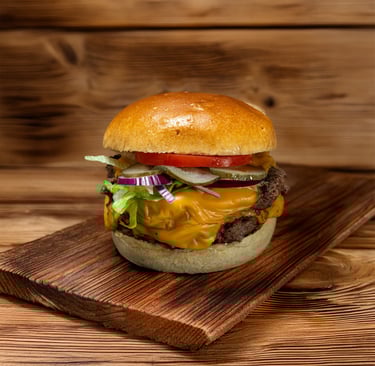 Pain brioché, deux steaks 150 g, double cheddar, salade, tomate, cornichons, oignons rouges - sauce burger